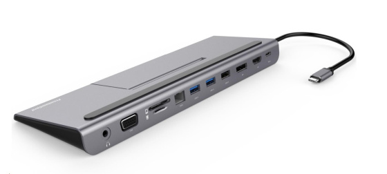 Dokovací stanice může sloužit jako podložka pod notebook, obsahuje čtečku SD karet, konektor RJ45 na připojení na počítačovou síť, 2x USB3.0 + 1x USB2.0, PD konektor 100W konektory a výstup audio na sluchátka nebo do reproduktorů.
