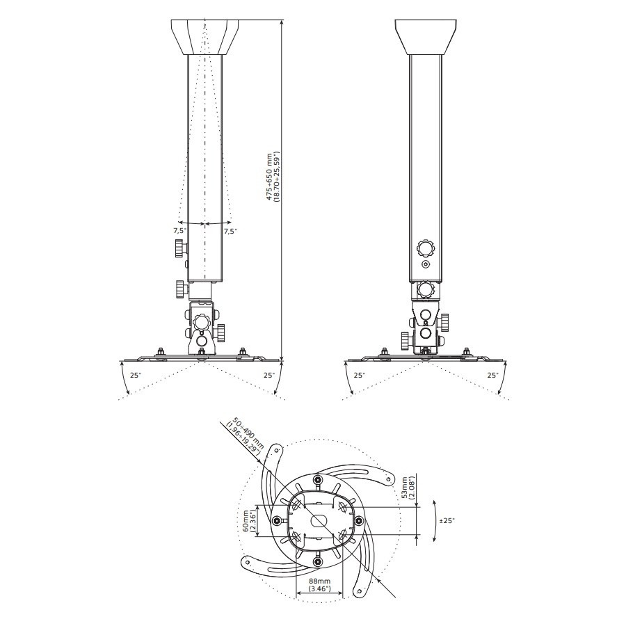 Profesionální designový stropní držák na projektor EDBAK PMV100 Stropní držák pro zavěšení projektoru s hmotností do 15kg, nejvyšší kvalita, design, nastavitelnost 45-65cm Ne vždy je možné použít obyčejný stropní držák na projektory, někdy je nutné použít držáky nejvyšší kvality a krásného designu. My Vám takové držáky na projektory nabízíme. Ucelená řada profesionálních stropních držáků na projektory v nadherném designovém provedení. Držáky jsou plně nastavitelné, vhodné pro 99% dostupných projektorů a dataprojektorů. Barevné provedení černé nebo bílé. Záruka 5 let. Pokud Vám záleží na designu stejně jako na kvalitě, jste na správné stránce. Profesionální délkově nastavitelný otočný a sklopný stropní držák na projektory Edbak PMV100 Technické údaje: nosnost 15kg univerzální držák pro uchycení 99% dostupných projektorů na projektory se 3 nebo 4 otvory pro uchycení rozteč otvorů pro uchycení v rozmezí 50-490mm délkové nastavení 450mm až 650mm otáčení do stran +/- 360° náklon do stran +/- 25° náklon nahoru a dole +/- 25° korekce roviny obrazu korekce nerovnosti stropu +/- 7,5° zajištění v požadované pozici systém pro skryté vedení kabeláže nejvyšší kvalita - profesionální provedení nádherný design bílé nebo černé provedení záruka 5 let Stropní a nástěnné držáky na projektory nejvyšší kvality, profesionální Edbak PMV100 Na stropní držák s nastavením délky 45-65cm EDBAK PMV100 je možné uchytit všechny projektory, které mají 3 nebo 4 otvory se závitem s roztečí 50mm až 490mm. Profesionální stropní nebo nástěnné držáky na projektory Edbak PMV100 Díky nejvyšší kvalitě a profesionálnímu provedení jsou držáky EDBAK řady PMV vhodné opravdu kamkoliv.. Fiber Mounts s.r.o., Nádražní 1296/4 69601 Rohatec Česká republika, mailto: info@drzakyastolky.cz
