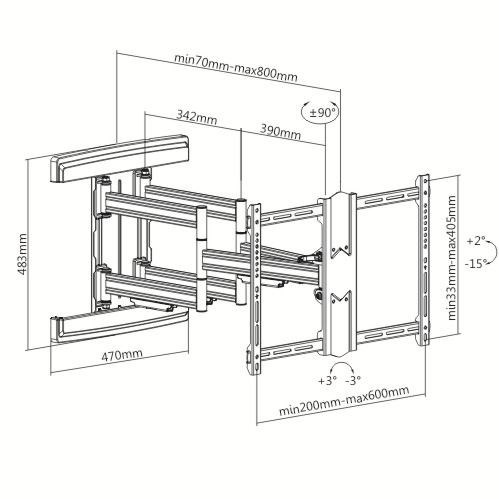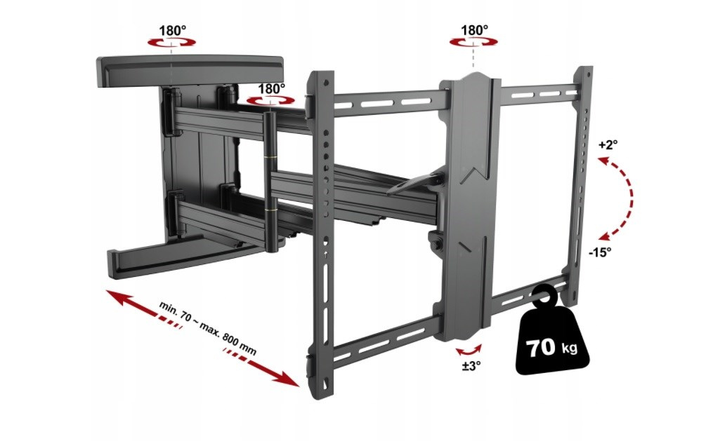 Profesionální držák na televize 43-90", vzdálenost od zdi 70-800mm, otáčení +/-75°, naklápění +2°/-15°, VESA 200x100 až 600x400, nosnost 70kg, kryty kabeláže, korekce roviny, posun nástěnného úchytu, nejvyšší kvalita.Více