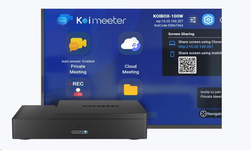 Zařízení KoiBox-100W s operačním systémem pro videokonference KoiMeeter je ideální náhradou nákladných konferenčních systémů založených na protokolu SIP a nabízí přidanou hodnotu v podobě bezdrátové projekce 4K, čtyřsměrné komunikace a funkcí lokálního úložiště. Při soukromých schůzkách pomocí zařízení KoiBox-100W je zajištěna vyšší bezpečnost a soukromí ve srovnání se schůzkami pomocí veřejných cloudů a funkce automatického přijímání poskytuje v určitých prostředích větší pohodlí. Kromě soukromých schůzek zařízení KoiBox-100W zefektivňuje komunikaci mezi různými platformami tím, že umožňuje připojení k hovorům Zoom®, Skype™, Microsoft Teams®, Cisco Webex® a Google Meet™.