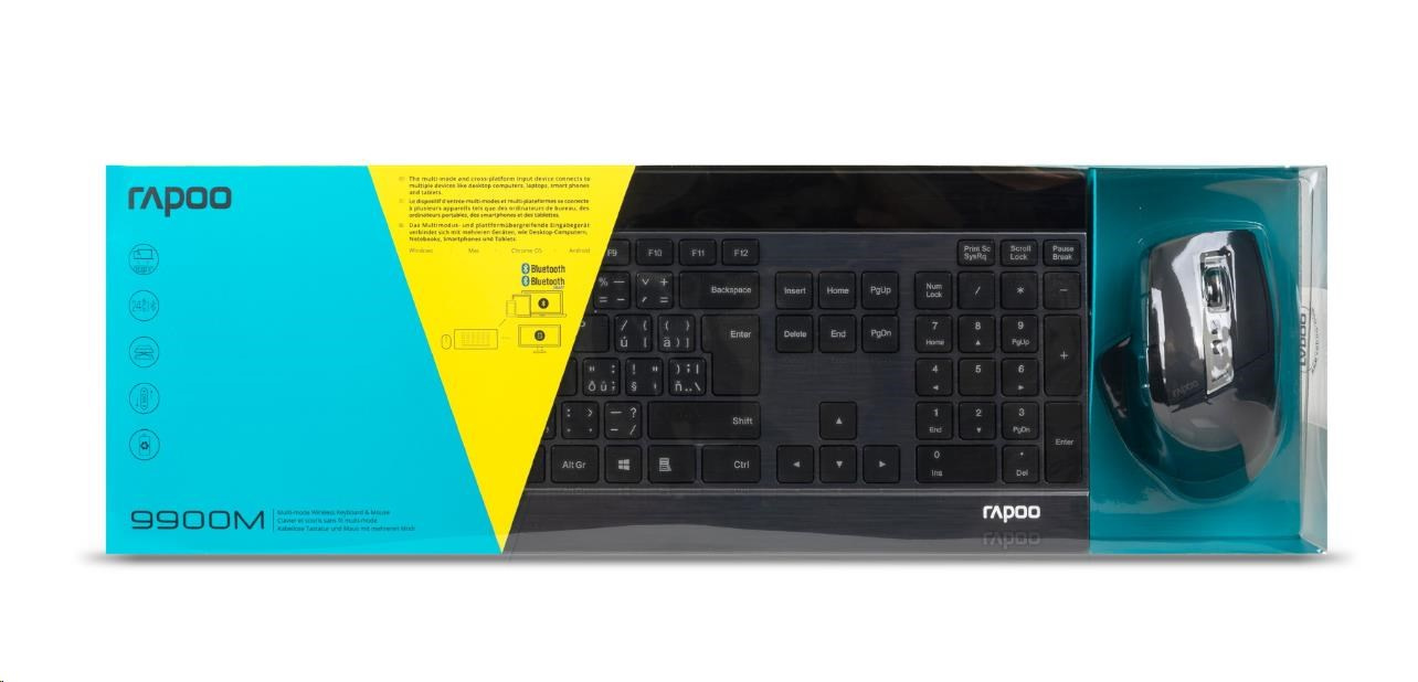Klávesnicový set 9900M není pokročilý jen ve vlastnostech a designu, ale také v konektivitě. Stolní sada pracuje prostřednictvím nejnovějšího bezdrátového připojení. K dispozici je standartní bezdrátový přenos 2,4 GHz pak technologie Bluetooth 3.0 nebo Bluetooth 4.0 (Smart). Díky této vysoké konektivitě můžete pracovat až na 4 zařízeních současně. Po spárování jednotlivých zařízení s klávesnicovým setem, budete vše jednoduše ovládat přes označené klávesy.