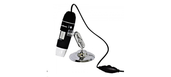 DigiMicroscope USB 200 s připojením pomocí USB2 na PC (Win XP-10), 640x480 px foto JPEG/video AVI - zobrazení a další úpravy na počítači. Rozlišení 2 Mpx, 25-200x zvětšení, 5x digital Zoom, osvětlení 8 LED s regulací, USB2. Rozměry 11,5x3,2 cm, hmotnost 52g. Včetně kovového držáku (malý stativ, dvě kulové hlavy), kalibrační pomůcky a instalačního CD.. Reflecta GmbH, Wiesenstr. 25 35630 Ehringshausen Německo, Kontakt přes formulář: https://www.reflecta.de/kontakt
