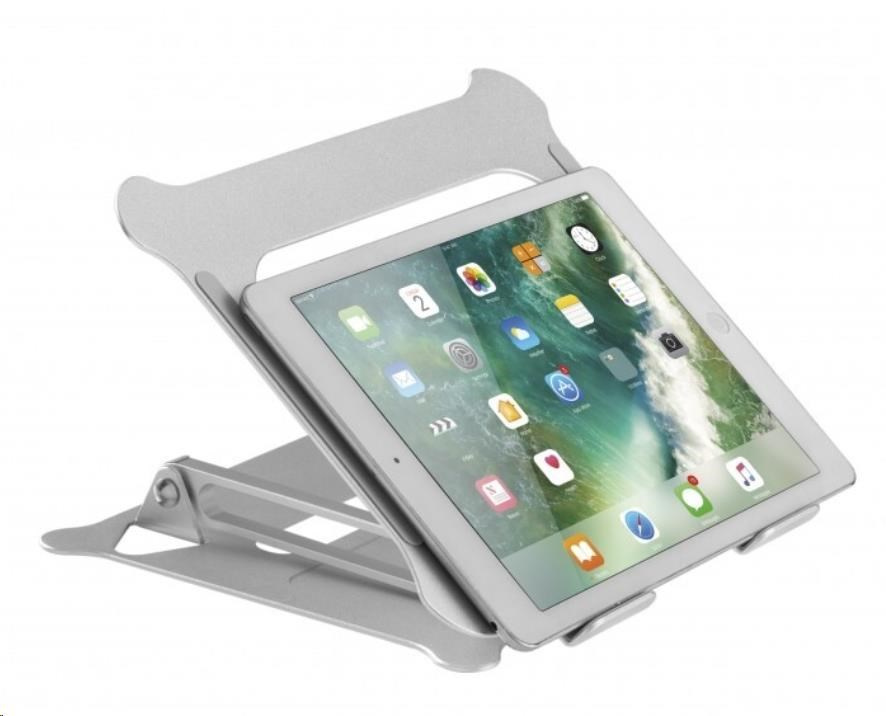 ERGOnomický hliníkový stojan na laptopy nebo tablety max 5kg pro dosažení optimálního nastavení náklonu a výšky 11-15" monitoru, přenosné provedení na stůl s protiskluzovými plochami a otvory pro ventilaci, pro použití externí klávesnice, rozměry 26x23x16 cm, barva stříbrná.