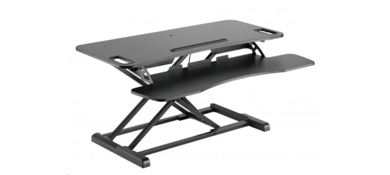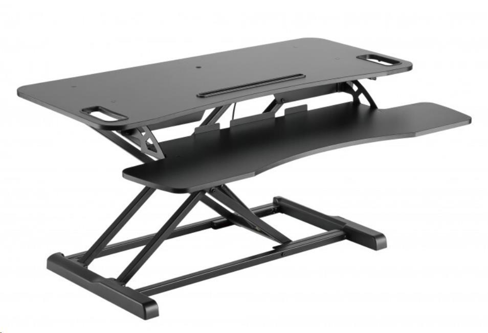 ERGOnomická pracovní plocha na laptop / monitor max 15kg a klávesnici max 2kg s X mechanizmem se vzduchovým pístem pro změnu výšky 10,6-50cm na stole, řešení změny pozice ze sezení na stání bez nutnosti úpravy kabeláže, rozměry 95x61,5x50 cm + plocha 94,5x30cm, barva černá.