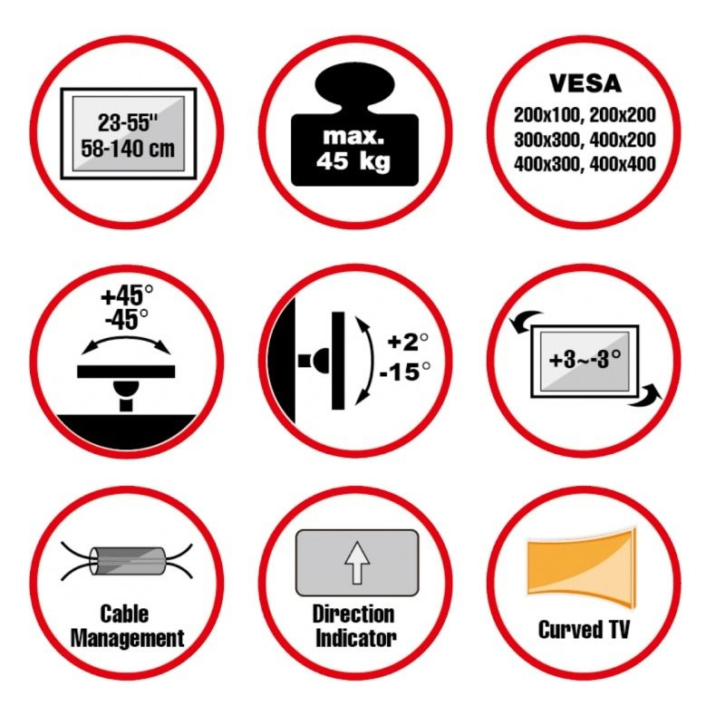 Nástěnný ocelový držák do rohu místnosti na LCD monitory a TV s uhlopříčkou 23"- 55" (58-140cm) a hmotností maximálně 45kg. 2x2 panty, vertikálně výklopný +2°/-15° a horizontálně otočný +45°/-45°, pro Curved TV, Cable Managment, materiál ocel, barva černá. Uchycení VESA: 100x200, 200x200, 300x200, 300x300, 400x200, 400x300, 400x400.. Reflecta GmbH, Wiesenstr. 25 35630 Ehringshausen Německo, Kontakt přes formulář: https://www.reflecta.de/kontakt