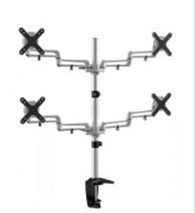 Stolní hliníkový držák s upevňovací klemou pro 4x LCD monitor a menší TV s uhlopříčkou 13"- 23" a hmotností maximálně 8kg na rameno. Uchycení VESA: 75x75, 100x100. Popis: 4x 43cm rameno - 3x pant, vertikálně výklopný +15°/-15° a horizontálně otočný 360°.. Reflecta GmbH, Wiesenstr. 25 35630 Ehringshausen Německo, Kontakt přes formulář: https://www.reflecta.de/kontakt