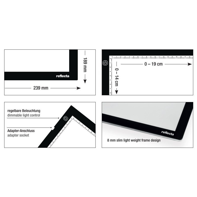 Prosvětlovací panel s moderní SuperSlim LED technologií, prosvětlovací plocha 19x14cm s měřítkem v cm na okraji plochy, plynulá regulace výkonu, dotykové ovládání, síťový zdroj AC/DC 12V/4,3W - 3,5mm Jack, životnost LED 50.000h. Rozměry 23,9x18,9x0,8cm, hmotnost 400g.. Reflecta GmbH, Wiesenstr. 25 35630 Ehringshausen Německo, Kontakt přes formulář: https://www.reflecta.de/kontakt