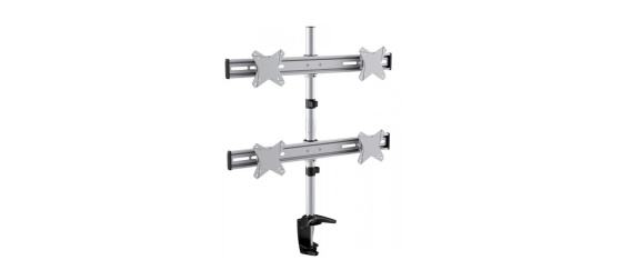 Stolní hliníkový držák s upevňovací klemou pro 4x LCD monitor a menší TV s uhlopříčkou 13"- 23" a hmotností maximálně 8kg na rameno. Uchycení VESA: 75x75, 100x100. Popis: vertikálně výklopný +15°/-15° a horizontálně otočný 360°.. Reflecta GmbH, Wiesenstr. 25 35630 Ehringshausen Německo, Kontakt přes formulář: https://www.reflecta.de/kontakt