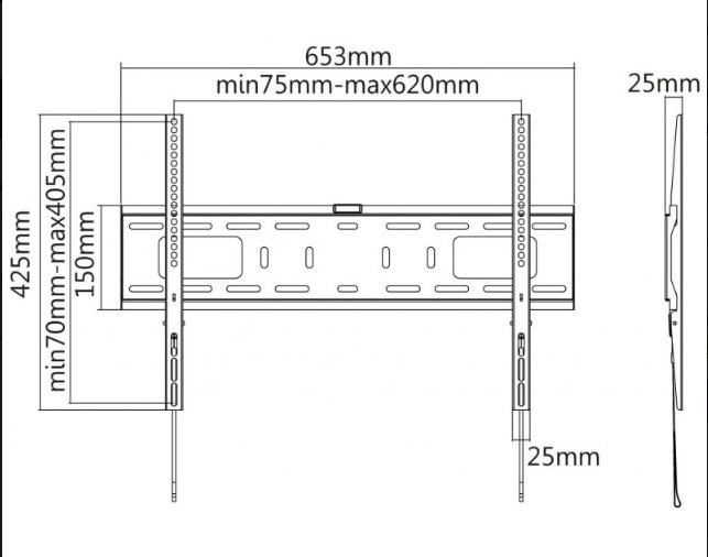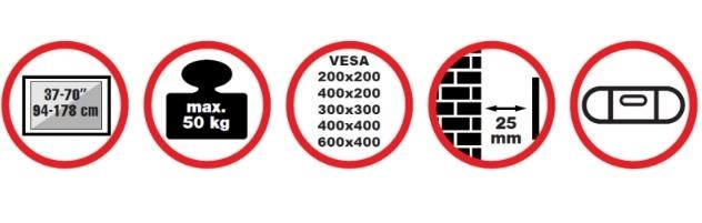 Nástěnný ocelový držák na Plasma a LCD TV s uhlopříčkou 37"- 70" (94-178cm) a hmotností maximálně 50kg. Konzole na zavěšení TV s vodováhou, není vertikálně výklopný, vzdálenost od stěny 25mm, materiál ocel, cenově výhodné, barva černá. Uchycení VESA: 200x200, 400x200, 300x300, 400x400, 600x400.. Reflecta GmbH, Wiesenstr. 25 35630 Ehringshausen Německo, Kontakt přes formulář: https://www.reflecta.de/kontakt
