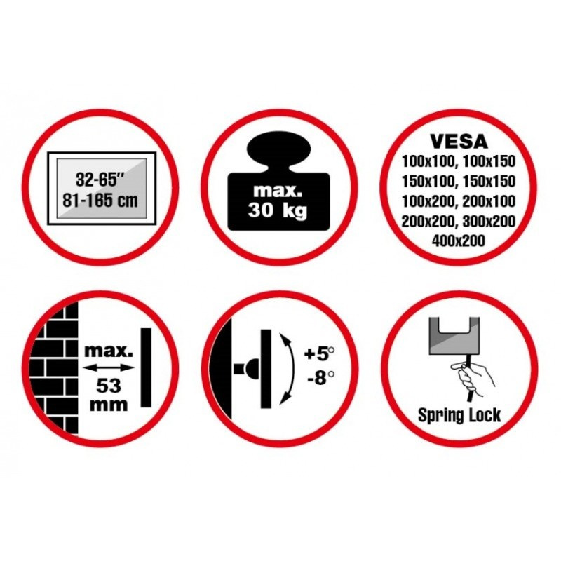 Nástěnný ocelový držák na OLED TV s uhlopříčkou 32"- 65" (81-165cm) a hmotností maximálně 30kg. Konzole na zavěšení TV s vodováhou, vertikálně výklopný +5°/-8°, vzdálenost od stěny 53mm, materiál hliník/ocel, zámek Spring Lock se šňůrou, měkká podložka, barva černá. Uchycení VESA: 100x100, 100x150, 150x150, 200x100, 200x200, 300x200, 400x200.. Reflecta GmbH, Wiesenstr. 25 35630 Ehringshausen Německo, Kontakt přes formulář: https://www.reflecta.de/kontakt