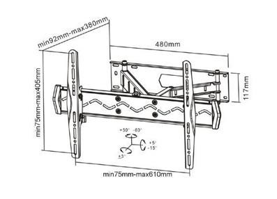 Nástěnný ocelový držák s bočním natáčením na Plazma a LCD TV s uhlopříčkou 37"- 70" (94-178cm) a hmotností maximálně 50kg. Uchycení VESA: 200x200, 400x200, 300x300, 400x400, 600x400. Popis: 3x pant, vertikálně výklopný +10°/-20° a horizontálně otočný +90°/-90°, vzdálenost od stěny 62-475mm, vodováha, materiál ocel, barva černá.. Reflecta GmbH, Wiesenstr. 25 35630 Ehringshausen Německo, Kontakt přes formulář: https://www.reflecta.de/kontakt