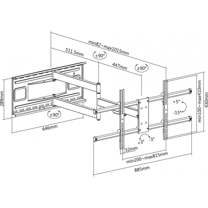 Nástěnný ocelový XL držák s bočním natáčením na LCD TV s uhlopříčkou 43"- 80" (109-203cm) a hmotností maximálně 50kg. 3x pant, vertikálně výklopný +5°/-15° a horizontálně otočný +90°/-90°, vzdálenost od stěny 82-1015mm, vodováha, Cable Managment, materiál ocel, barva černá. Uchycení VESA: 200x200, 300x200, 400x200, 300x300, 400x300, 400x400, 600x400, 800x400.. Reflecta GmbH, Wiesenstr. 25 35630 Ehringshausen Německo, Kontakt přes formulář: https://www.reflecta.de/kontakt