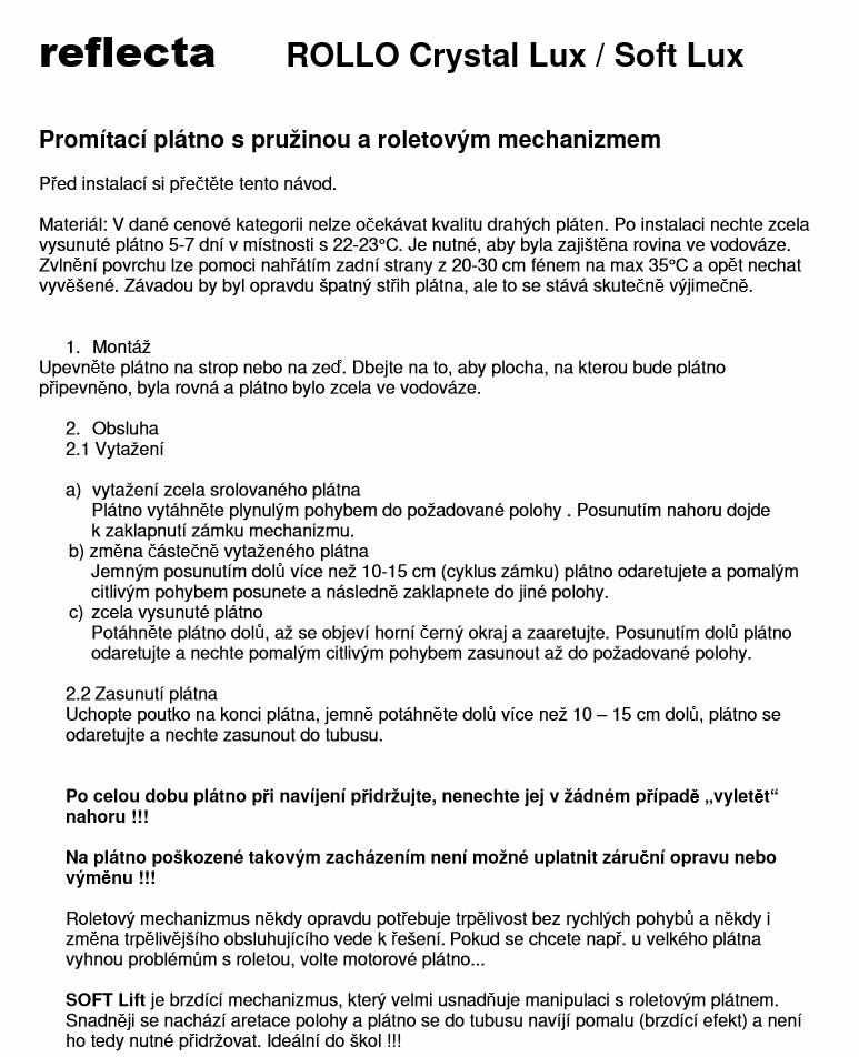 Roletové plátno ROLLO CrystalLine 180x141cm, viditelná plocha 174x108cm, 16:10, 81"/205cm, bílý hranatý kovový tubus 7x195cm/7kg, uchycení na stěnu nebo strop, materiál BetaLux - bílá 0,35 tkanina 300g/m2 s 3cm černým okrajem a zadní stranou, Gain=1,0, pozorovací úhel 120°. Lux - bílý matný povrch pro maximálně věrný a kontrastní obraz při alespoň částečném zatemnění. PVC materiál s textilním základem vytváří rovnou plochu bez zvlnění ale v krajích může docházet k prohnutí - postupně mizí. Snadné uchycení 4 vruty na plastových bocích plátna - stěna nebo strop. Možnost aretace polohy plátna při každé otáčce mechanizmu. Pozor při zpětném navíjení plátna je nutné plátno přidržovat - nesmí dojít k rychlému navinutí, které při nárazu na tubus může poškodit vnitřní mechanizmus bez možnosti uplatnění záruční doby.. Reflecta GmbH, Wiesenstr. 25 35630 Ehringshausen Německo, Kontakt přes formulář: https://www.reflecta.de/kontakt