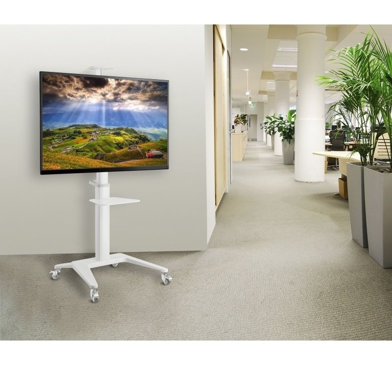 Televizní stolek na velké LCD TV s uhlopříčkou 37"- 70" (94-178cm) a hmotností maximálně 50kg. Středový nosný profil 125-160cm na kolečkách s aretací, držák výklopný +5°/-12°, horní výškově nastavitelná otočná plocha pro kameru max 5kg , polička 34x46cm max 5kg, Alu/ocel, barva bílá. Uchycení VESA: 200x200, 300x300, 400x200, 400x400, 600x400.. Reflecta GmbH, Wiesenstr. 25 35630 Ehringshausen Německo, Kontakt přes formulář: https://www.reflecta.de/kontakt