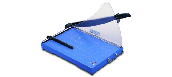 Páková řezačka na papír pro formát A3 (do 448 mm délky řezu) vhodná pro použití v kanceláři. Provedení s pevnou celokovovou základnou a posuvným dorazem. Je vybavena bezpečnostním krytem nože z odolného plastu, možností aretovat nůž ve spodní poloze. Základna řezačky má kovový úchop pro snadnou manipulaci. Max. tloušťka řezu 20 listů 80g papíru, ruční přítlak. Rozměry kovové základové desky 480×330 mm. Na desce jsou naznačeny formáty A3-A6. Rozměry: 360×535×445 mm, hmotnost: 4,9 kg. , ,