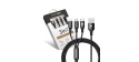 Kabel podporuje přenosovou rychlost až 480Mbps a disponuje výstupním proudem 1A. Délka kabelu 1.2m je dostatečná pro pohodlné používání. Kvalitní nylonové opletení je odolnější vůči ohybům a dalšímu poškození oproti klasickým silikonovým kabelům a tím zaručí dlouhou životnost. Kabel lze sepnout poutkem na suchý zip do skladnější podoby na cesty. Díky své univerzalitě je možné najednou propojit širokou škálu mobilních zařízení při nabíjení pouze z jednoho adaptéru.