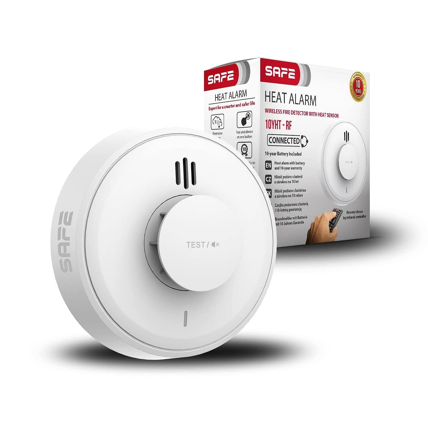 Termistorový teplotní hlásič požáru SAFE 10YHT – RF byl navržen pro široké spektrum aplikací a prostředí, ve kterých nelze zabezpečit spolehlivou detekci požáru formou konvenčních technologií. Poskytuje efektivní řešení při detekci požáru s rychlým nástupem teploty během hoření nebo při pomalu se rozvíjejícím požáru generujícím nárůst teploty v monitorovaném prostoru. K detekci využívá hlásič technologie inteligentního predikčního algoritmu v kombinaci s termistorovým senzorem třídy A1, konstrukčně navrženým mimo kryt k zajištění bezprostřední odezvy spuštění poplachu bez dalšího zpoždění.