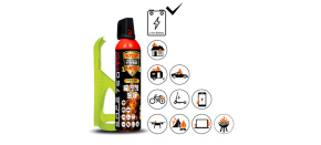 Univerzální hasicí sprej SAFE 500 spolu s držákem SAFE 50F certifikovaný pro hašení požárů A, B, C, E (1000V), F. Hasicí sprej je pohotový a maximálně účinný pomocník pro okamžitou likvidaci požáru. Obsahuje nemrznoucí složku..