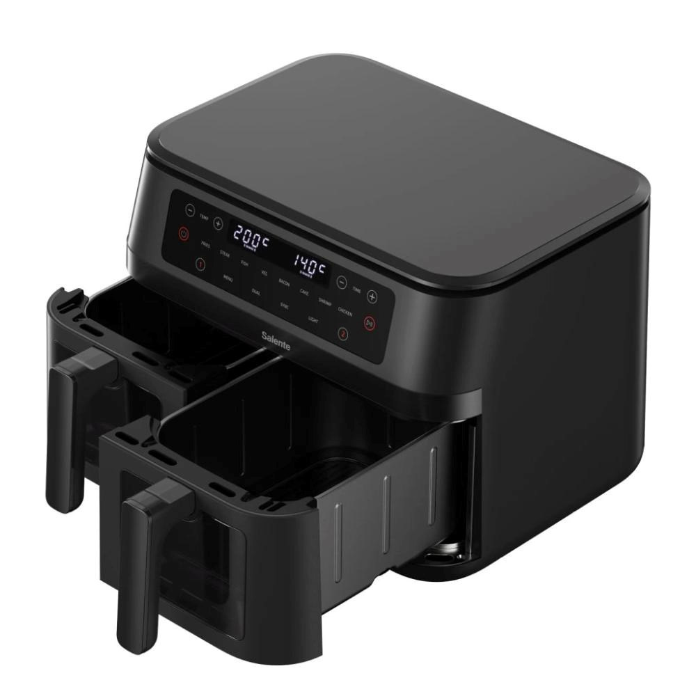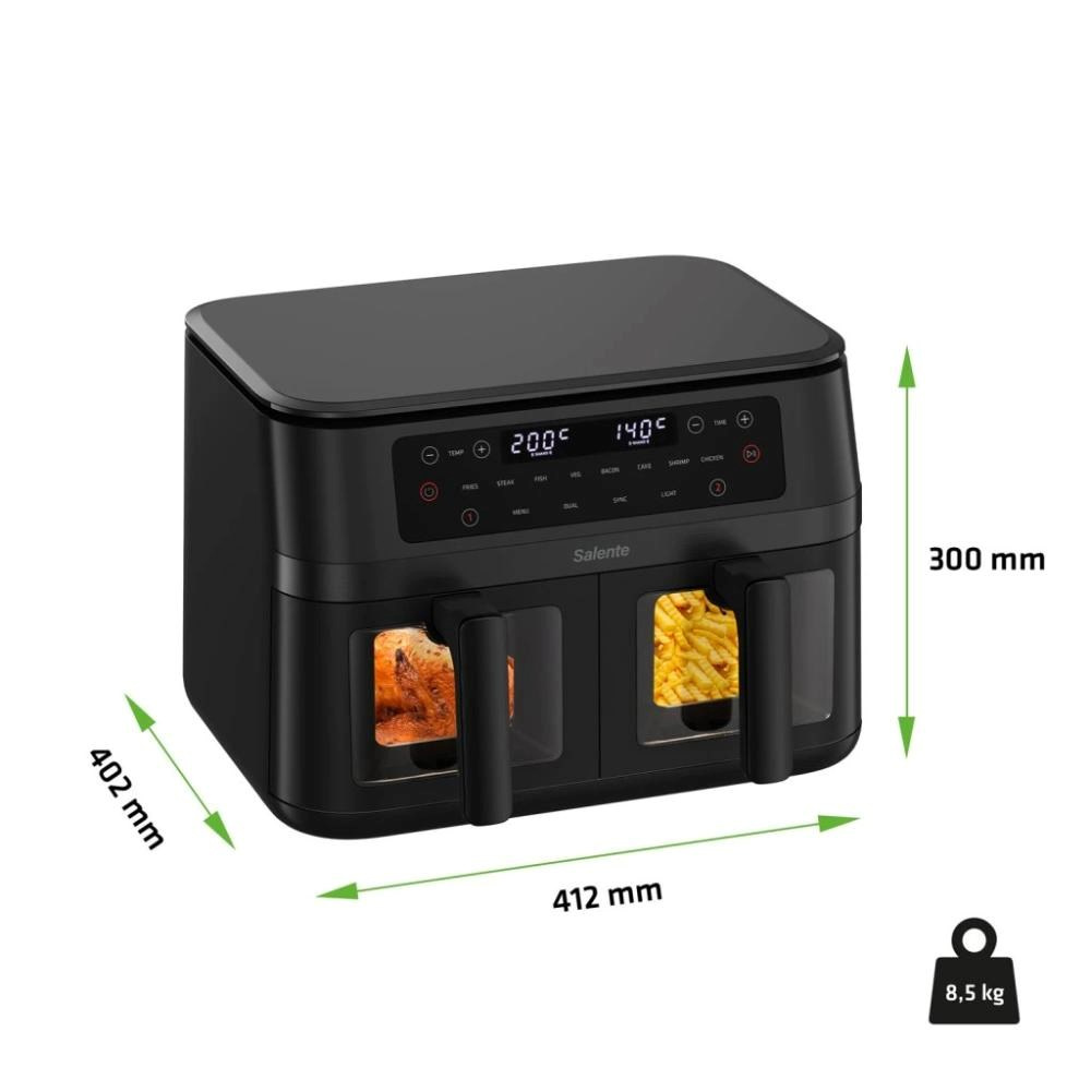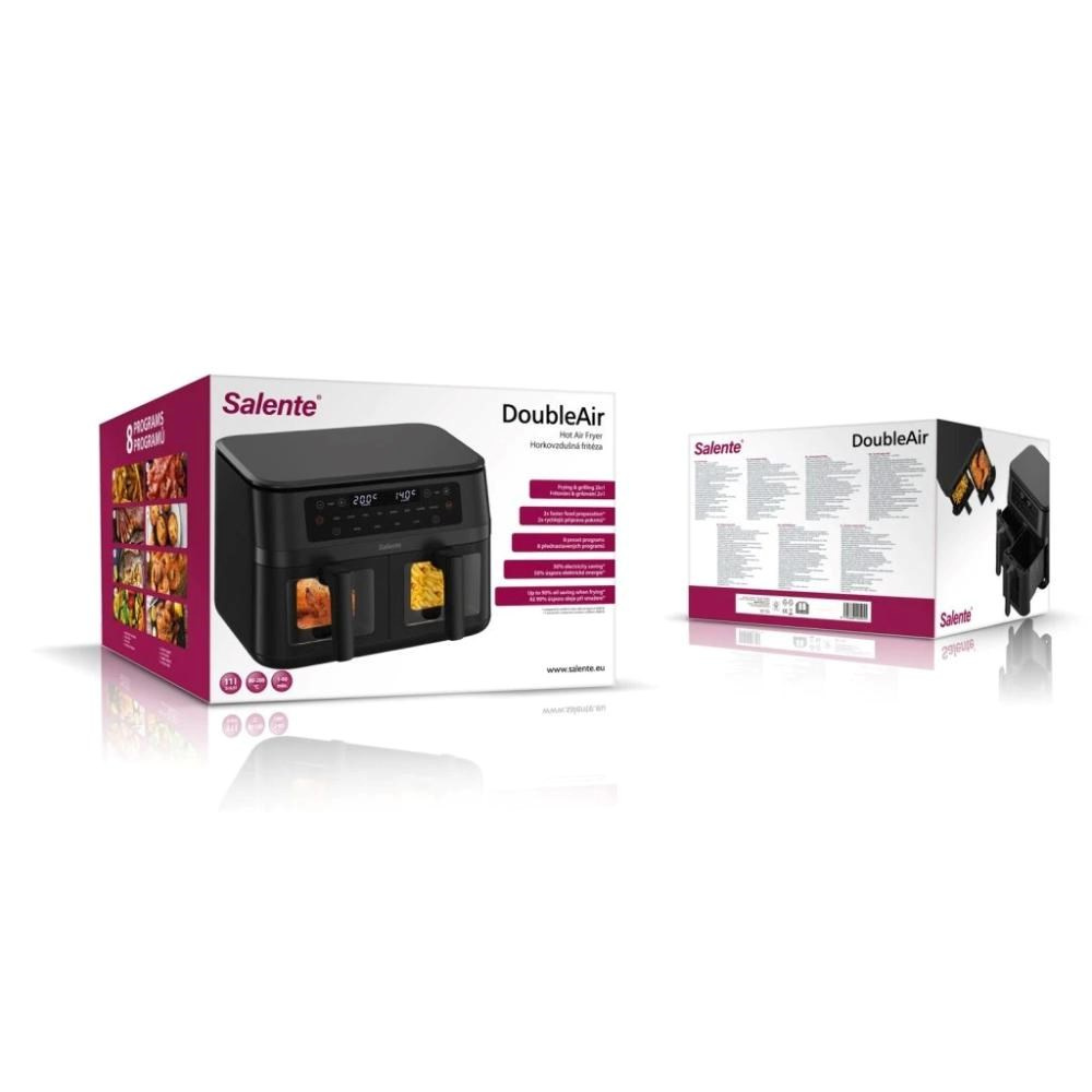 Představte si, že si doma připravujete křupavé hranolky, šťavnaté steaky nebo neodolatelný sladký dezert, a přitom si neděláte starosti s nezdravým tukem ani zbytečnými kaloriemi navíc. Horkovzdušná fritéza Salente DoubleAir převede tento sen v realitu. Místo ponoření do oleje totiž využívá horký cirkulující vzduch. Díky tomu vytváří na chystaných ingrediencích křupavou texturu, ovšem s minimem tuku. Umí fritovat i grilovat a k jejím výhodám patří i přítomnost dvou nezávislých fritovacích košů (s celkovým objemem 11 litrů) pro přípravu dvou různých pokrmů najednou. Z vaší kuchyně zkrátka vykouzlí místo, kde si opojné chutě a vůně podávají ruku se zdravým životním stylem.