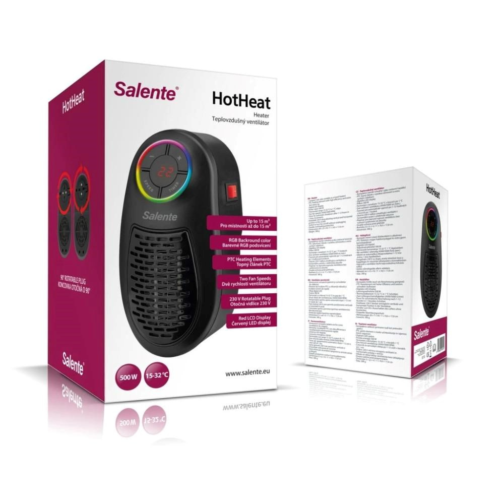 Díky PTC topnému článku a příkonu 500 W vás Salente HotHeat přivítá hřejivým objetím hned po zapnutí. Chcete si ráno hodit sprchu, ale v koupelně je po chladné noci (mírně řečeno) nevlídno? Zastrčte Salente HotHeat do zásuvky a za chvilku bude líp. Nebo se vracíte z horské túry do vychladlé chaty a jste celí promrzlí? Zásluhou tohoto teplovzdušného ventilátoru roztajete podobně rychle jako kousek rampouchu v dlani. Přístroj totiž začíná hřát bez zbytečného vyčkávání a navíc je vybaven výkonným ventilátorem, který dokáže teplo rychle rozšířit do celé místnosti.