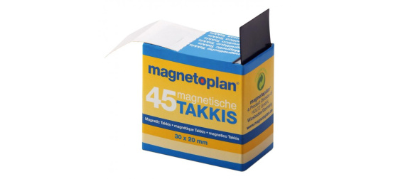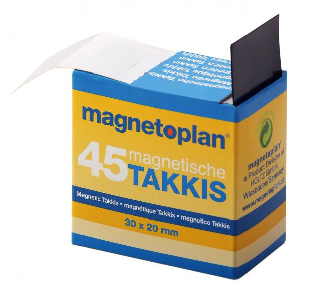 Samolepící magnety Magnetoplan Takkis, 45 ks velikosti 30×20 mm a tloušťky 0,75 mm. Lze je snadno vytahovat z dávkovače. Nalepením samolepících magnetů na zadní stranu papíru, kartonu, fotky atp, vytvoříte magneticky přichytitelný objekt. Můžete jej pak připevnit na magnetickou tabuli, do magnetické vitriny nebo na flipchart. Výhodou je, že magnety Takkis umožňují vytvořit z vnějšku neviditelné magnetické přichycení.. Holtz Office Support GmbH, Berta-Cramer-Ring 14-16, Wesbaden 65205, DE, info@holtz-gmbh.de