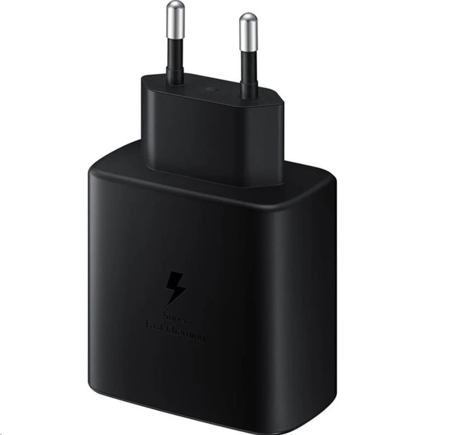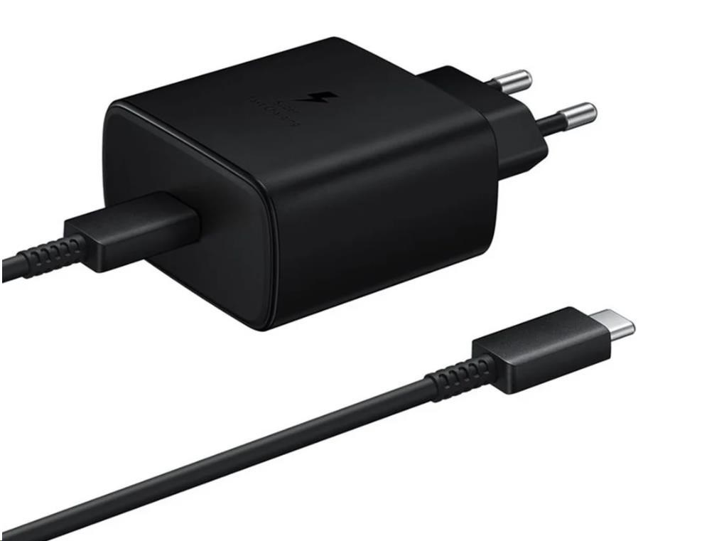 Samsung cestovní nabíječka do sítě s maximálním výkonem 45W, USB-C výstupem a USB-C kabelem dlouhým 1,8m.