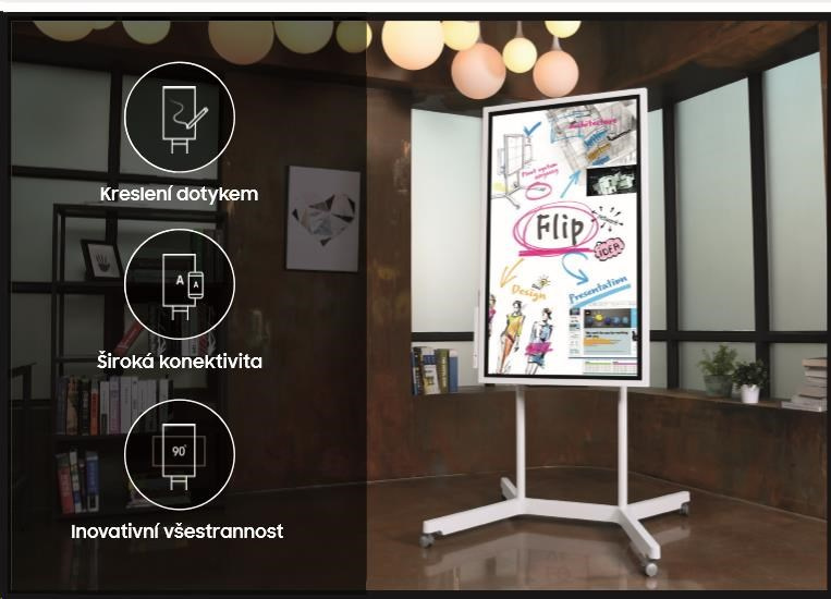 Elegantní světle šedý vzhled Samsung Flip z něj činí perfektní doplněk každého moderního pracoviště. Pyšní se ergonomickým designem s možností naklonění o 4,5 stupně. Také je vybaven pouzdrem na pero a odkládací poličkou. Flip je jednoduše připraven poskytnout vám moderní způsob působivé prezentace myšlenek i praktické pomůcky pro každodenní práci.