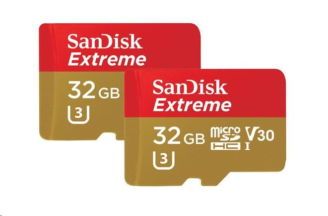SanDisk MicroSDHC karta 32GB Extreme (100MB/s, A1 C10 V30 UHS-I U3, pro akční kamery) + adaptér, Twin Pack