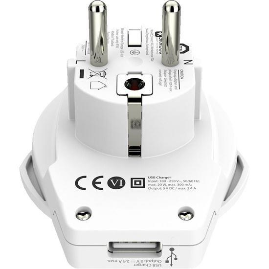 Univerzální adaptér s uzemněním, max. 16A, integrovaný USB nabíjecí adaptér, 2400mA, výhodné spojení dvou zařízení v jednom, pro cizince navštěvující ČR, SR nebo pro připojení zahraničního výrobku s jinou vidlicí přívodní šňůry v českých zásuvkách, všechny spotřebiče s 2- a 3-kolíkovou šňůrou.Více