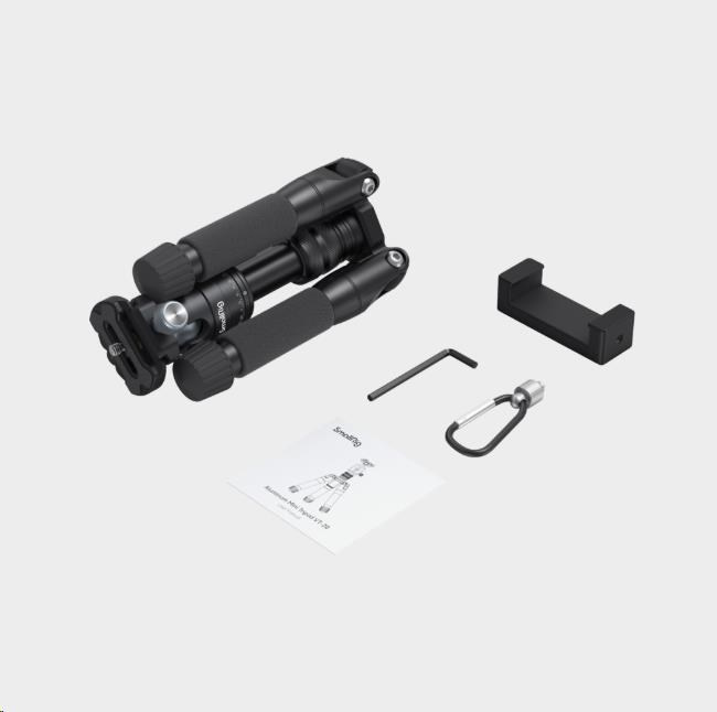 Balení obsahuje: 1x sada stativu 1x držák pro chytrý telefon 1x háček 1x imbusový klíč 1x uživatelská příručka