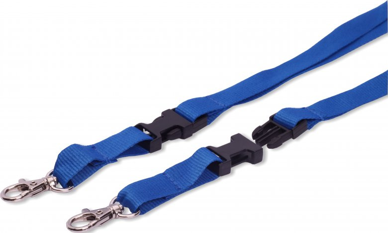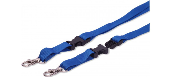 Plochá šňůrka s karabinkou modré barvy. Šířka sňůrky 20 mm, délka 90 cm..