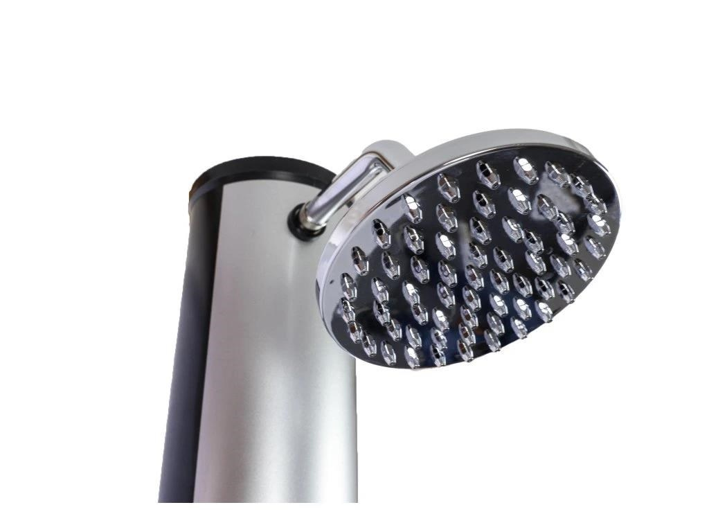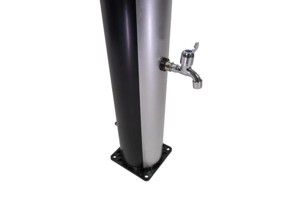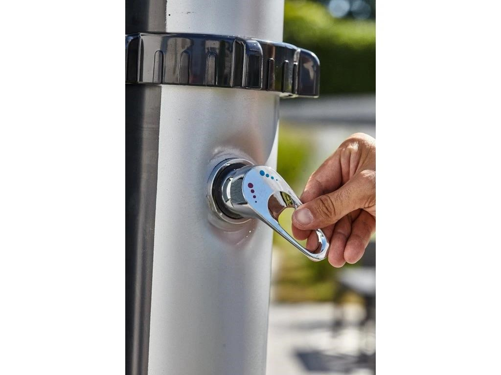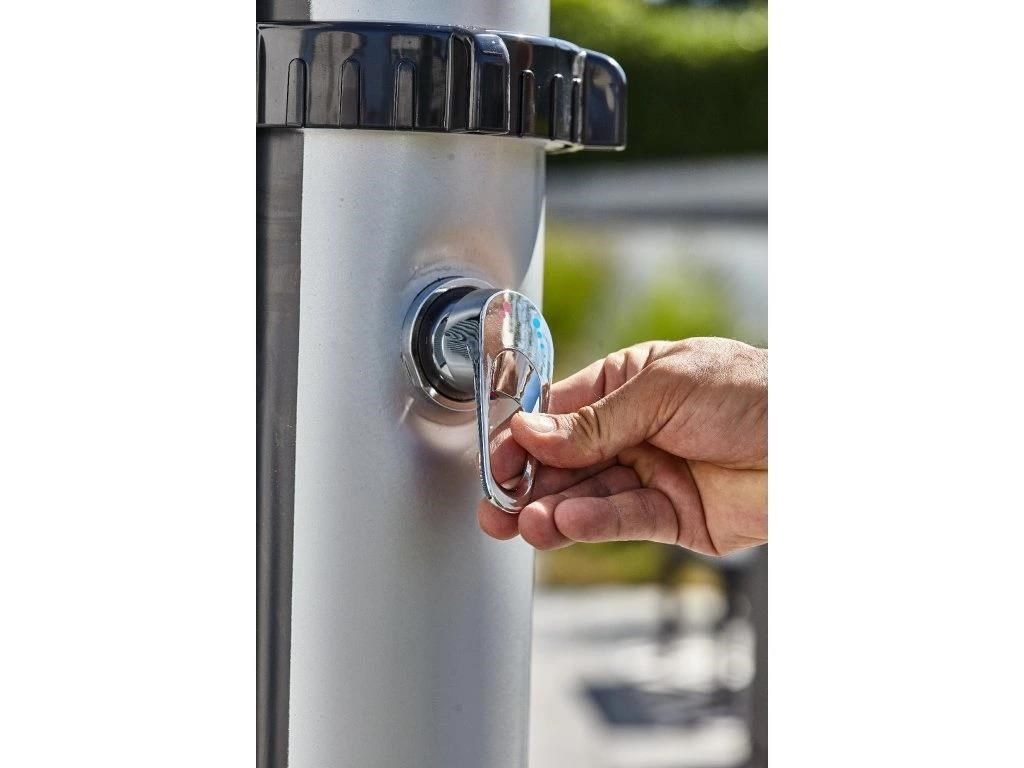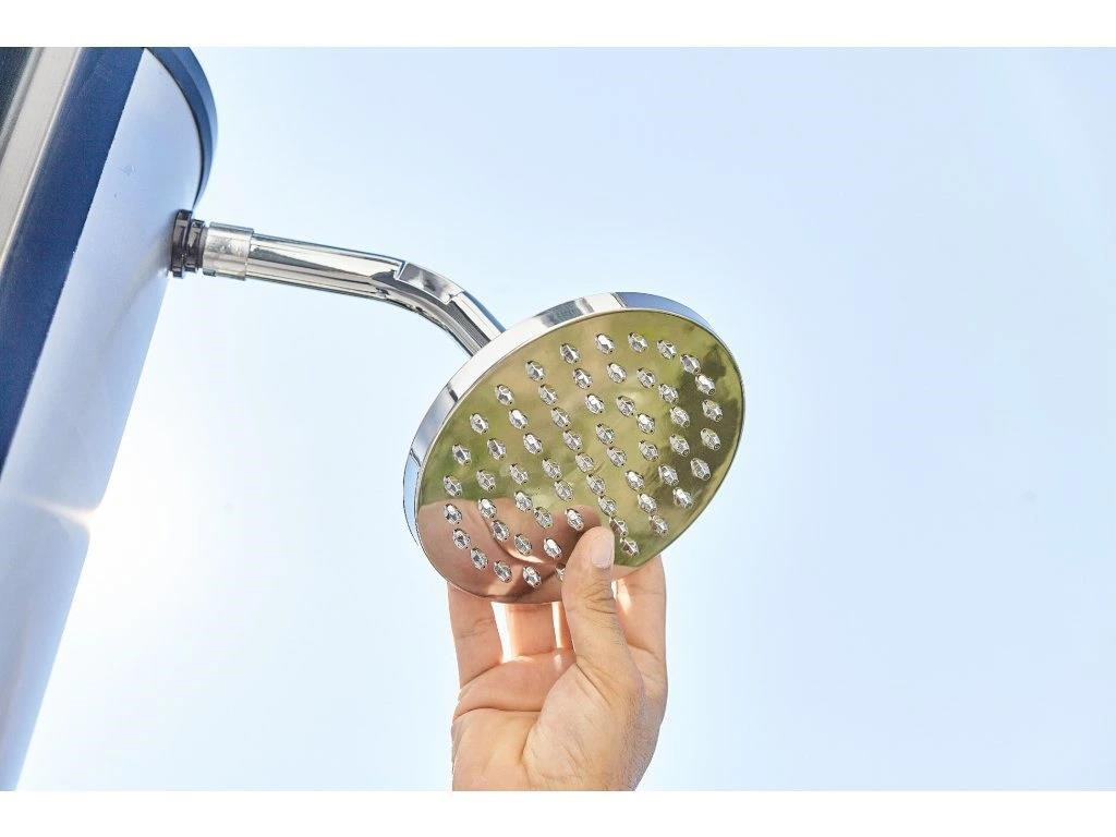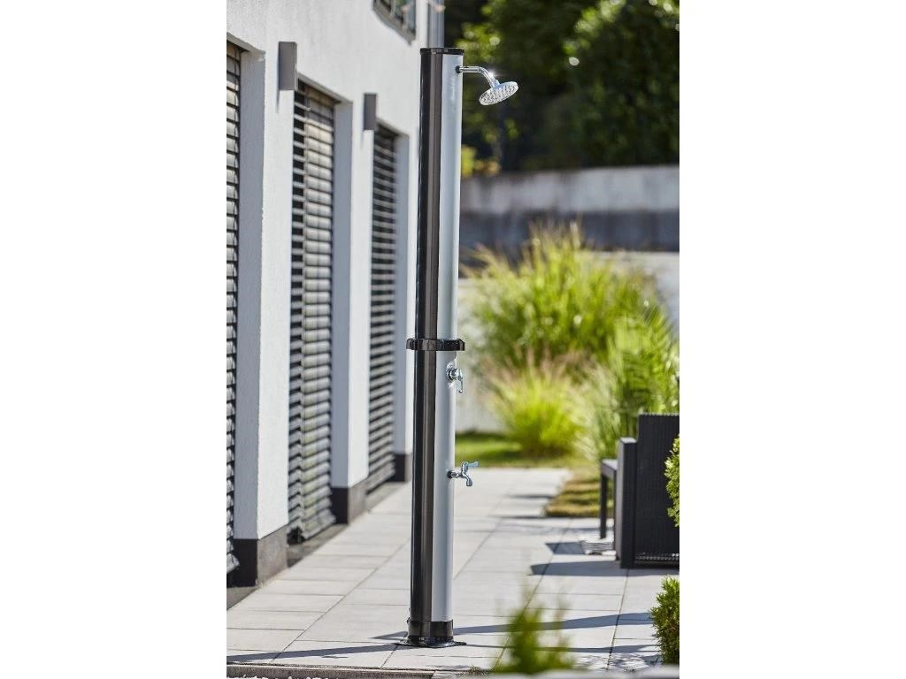 Rodinami oblíbená solární sprcha s XXL zásobníkem o objemu 40 l a velkou sprchovací hlavicí, která zajišťuje příjemné sprchování připomínající lehký letní deštík. Sprcha je vyrobena z kvalitního PVC odolného vůči UV záření. Elegantní vzhled sprchy podtrhuje čelní část imitující nerez. Sprcha je vysoká 220 cm a je vybavena praktickým kohoutkem na oplach nohou. Připojení na přívod vody je velmi jednoduché pomocí hadicové rychlospojky (součástí balení).