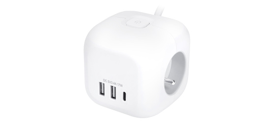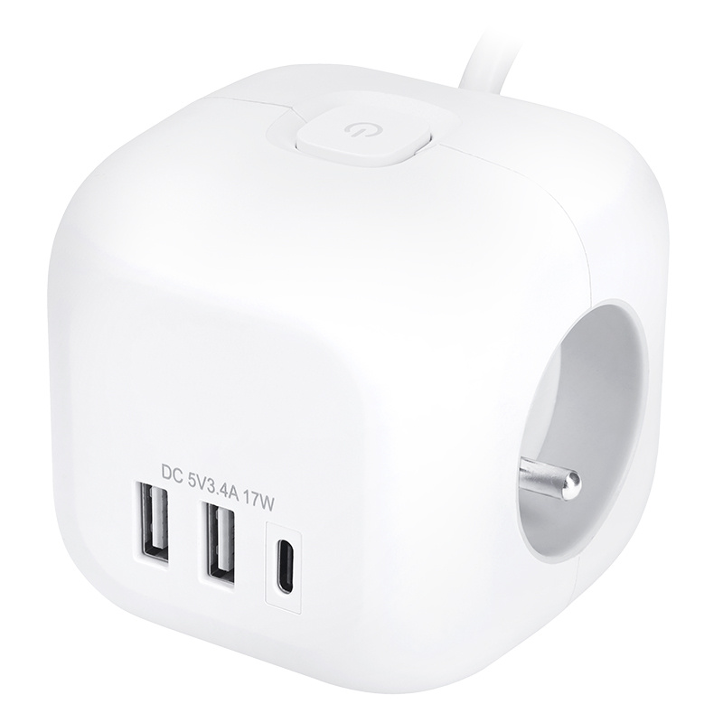 Prodlužovací přívod ve tvaru kostky s délkou strany 8 cm spojuje tři uzemněné zásuvky s dětskou pojistkou a USB nabíječku s porty USB-C a USB-A. Díky 2m dlouhému kabelu poskytuje flexibilní využití. Protiskluzové podložky udržují přívod stabilní na stole nebo pracovní ploše. Podsvětlený vypínač umožňuje snadné ovládání všech zásuvek i USB portů.
