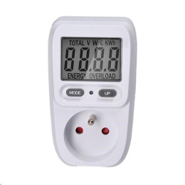 přehledný LCD displej, úhlopříčka 2" - 5cm max. měřená spotřeba: 9999kWh min. množství zaznamenávaného příkonu: 2W, max.: 3680W/16A nastavení ceny za energii 2 tlačítka pro jednoduchou obsluhu přesný výpočet ceny a měření spotřebované energie dětská pojistka indikace překročení max. příkonu "overload" měření elektrických veličin: napětí, okamžitý odebíraný výkon integrovaný stabilizátor napětí až do +- 1,5% odchylky od jmenovitého napětí pro přesné měření pracovní teplota: 0 až + 50°C napájení: AC 230V, 50Hz. Solight Holding s.r.o., Na Pankráci 1685/17, 140 00 Praha 4, Česká republika, info@solight.cz