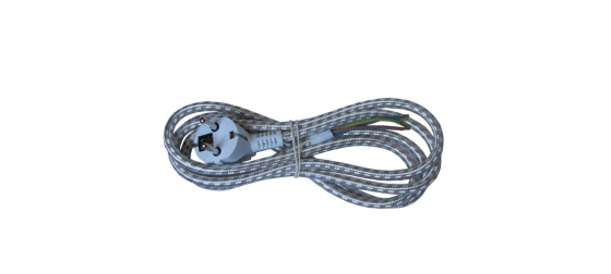 Opletená umělá textilie, průřez vodičů: 3 x 0,75mm2, typ kabelu: H05RT-F3, lomená vidlice, barva: šedobílá, délka: 3m.