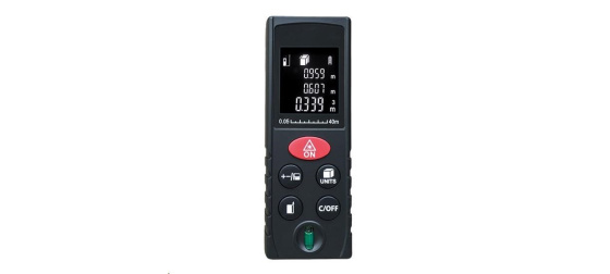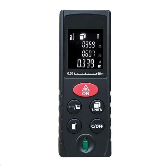 měření vzdálenosti, výpočet plochy, objemu a měření pomocí Pythagorovy věty (vypočtení délky třetí strany ze dvou známých délek stran) rozsah měření vzdálenosti: 0,05 - 40m jednotky: m, ft, in třída laseru: II, měné než 1mW typ laseru: 620-690nm přesnost měření ±2mm rozlišení: 1mm teplotní rozsah použití 0 - 40°C podsvícení displeje vodováha pamět pro 20 posledních měření automatické vypnutí počet měření bez výměny baterií: >5000 indikátor vybité baterie baterie: 2x1,5V, AAA rozměry: 110x40x25mm. Solight Holding s.r.o., Na Pankráci 1685/17, 140 00 Praha 4, Česká republika, info@solight.cz