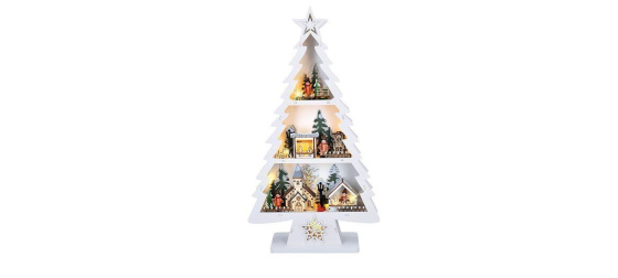 Solight LED dřevěný vánoční stromek s dekoracemi, 13x LED, bílá, 53cm, 2x AA