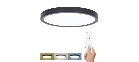 LED stropní svítidlo Estela v černém tenkém provedení je ideálním řešením pro moderní interiéry. Díky dálkovému ovladači můžete plynule regulovat jas, měnit barevnou teplotu světla (3000K–6500K) a volit mezi přednastavenými režimy. Maximální příkon 36W a světelný tok až 2700 lm (při 4000K) zajišťují dostatek světla pro každodenní použití.