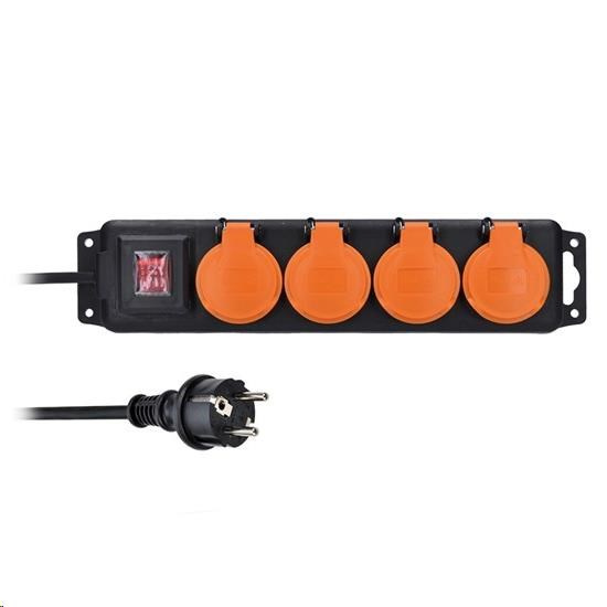 Solight prodlužovací přívod IP44, 4 zásuvky, gumový kabel, vypínač, venkovní, ,5m