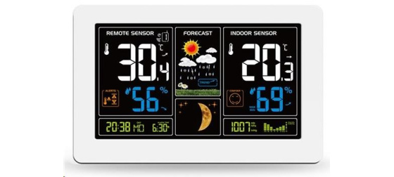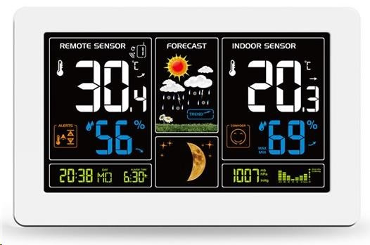 měření vnitřní teploty: 0°C až +50°C měření venkovní teploty: -40°C až +60°C měření vnitřní a vnější vlhkosti: 20% - 95% měření atmosférického tlaku: 600 hPa/mb - 1100 hPa/mb USB nabíjecí adaptér DC 5V/1000mA upozornění na dosažení nastavené venkovní teploty paměť minimálních a maximálních dosažených hodnot teploty a vlhkosti, vnější i vnitřní možnost připojení až 3 bezdrátových senzorů, funkce cyklického přepínání mezi jednotlivými senzory 1 bezdrátový senzor (součástí balení), dosah 60 m ve volném prostoru předpověď počasí v 6 grafických úrovních s indikátorem vývoje ukazatelé stavu baterie pro meteostanici i bezdrátový senzor ukazatel úrovně komfortu čas řízený rádiovým signálem, kalendář, fáze Měsíce budík s intervalem, odložení buzení 5 min indikátor vývoje teplot, tlaku a vhkostí barevný podsvícený displej 7.5" (17,0 x 9,4cm) úsporný režim displeje, 5 úrovní podsvícení displeje, rozsvícení displeje a odložení budíku pomocí dotykového senzoru na horní hraně meteostanice. rychlý a komfortní přístup k ovládacím tlačítkům na boční hraně meteostanice otvor pro uchycení na zeď, opěrný stojánek rozměry meteostanice: 20,5 x 13 x 3 cm max. barva: bílá napájení: hlavní jednotka: 2 x AA (LR03) baterie (není součástí balení) adaptér AC 230V,50Hz /DC 5V, 1200mA (součástí balení) senzor: 2 x AA (LR03) baterie (není součástí balení)