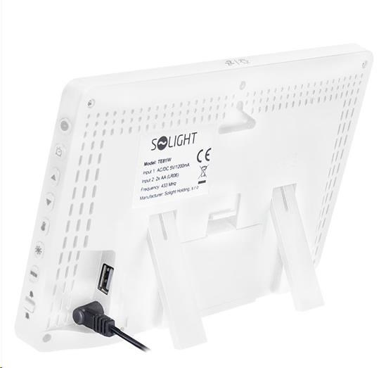 Popis Solight TE81W meteostanice, extra velký barevný LCD, teplota, vlhkost, tlak, RCC, USB nabíjení, bílá