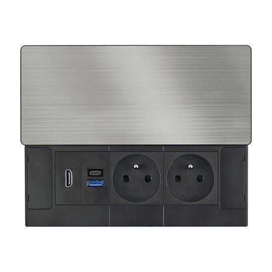 Velkou výhodou je integrovaný HDMI 2.0 port, který umožňuje snadné propojení notebooku s monitorem, televizí nebo projektorem – ideální pro prezentace, home office i domácí zábavu. Celý modul je připraven i na budoucí rozšíření: jednu síťovou zásuvku 230 V lze nahradit až dvěma RJ45 datovými moduly, což ocení zejména kancelářské a provozní prostory.