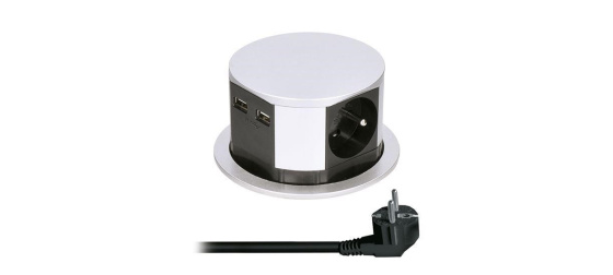 Solight výsuvný blok zásuvek, 3 zásuvky, 2x USB, kruhový tvar nízký, prodlužovací přívod 1,5m, 3 x 1mm2, stříbrný