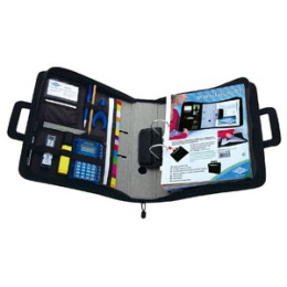 Součástí spisovky jsou kapsy na vizitky, kapesní kalkulátor, tužky a další drobné potřeby
