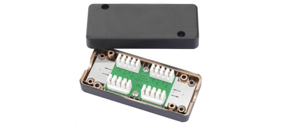 Propojovací box CAT6. Umožňuje propojit kabelové segmenty beze ztráty kvality vedení. Narážecí kontakty.