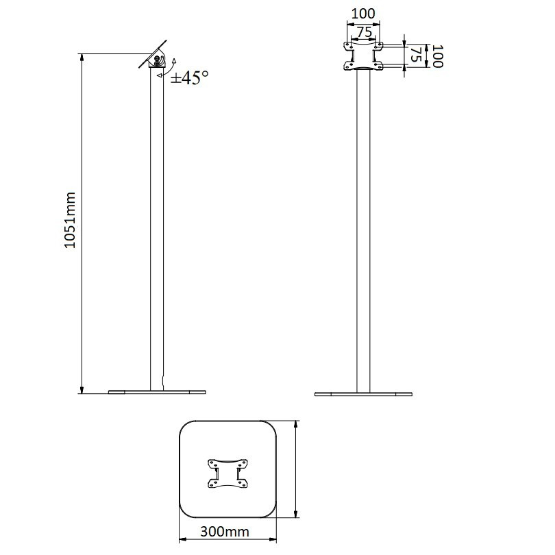 Stojan na monitory Tv EDBAK ITSV01 Podlahový stojan na monitor nebo Tv 15-32", výška 105cm, nastavení sklonu obrazovky 0-45°, VESA 75x75 a 100x100, nosnost 8kg Kvalitní velmi pěkný podlahový stojan na monitory nebo televize s úhlopříčkou 15-32". Stojany jsou ideální pro umístění monitoru do prostoru, kde není možnost nebo není vhodné použití nástěnných držáků. Stojan má fixní výšku 105cm, obrazovku monitoru je možné naklápět v rozmezí 0° (vodorovně) až 45°. Podporuje VESA standardy 75x75 a 100x100, je možné použít nástavce pro rozšíření na 200x100 a 200x200. Doporučené maximální zatížení 8kg. Stojan na All in One PC, dotykové monitrory, klasické LCD, LED, TFT monitory nebo menší televizory - EDBAK ITSV01 Technické údaje: maximální zatížení 8kg podporuje VESA standardy 75x75 a 100x100 na obrazovky s úhlopříčkou 15" až 32" náklon obrazovky 0°až 45° výška stojanu 1051mm rozměry podstavce 300x300x10 mm / materiál litina hmotnost stojanu 10kg systém skrytého vedení kabeláže barevné provedení podstavce a držáku: černá barevné provedení tyče (nosníku): chrom profesionální kvalita, perfektní zpracování krásný design záruka 5 let Stojan Edbak ITSV01 podporuje VESA standardy: VESA 75x75 VESA 100x100 možnost zakoupit rozšíření na VESA 200x100 a 100x200 možnost zakoupit rozšíření na VESA 200x200 Nejčastější použití stojanu: prodejny obchody a obchodní centra informace a informační centra restaurace, provozovny recepce, hotely pracoviště k pokladním systémům výrobní a podnikové haly.