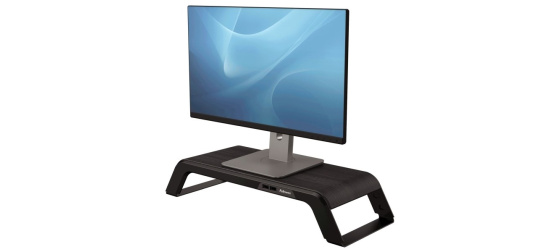 • série HANA™ • moderní minimalistický design • snadné nastavení výšky do 3 poloh: 102, 127, 153 mm • pro monitory do maximální hmotnosti do 18 kg • vybaven 4 USB porty • duální datové porty USB směřující dozadu pro snadné připojení myši a klávesnice • snadná instalace bez nutnosti použití nástrojů • barva černá • materiál kovová základna s povrchem pravého dřeva • rozměr horní plochy (hxš) 194 x 402 mm • rozměry (hxvxš) 222 x 102-153 x 560 mm. Fellowes, Inc., 1789 Norwood Avenue Itasca, IL 60143-1095 USA, inquiries@fellowes.com