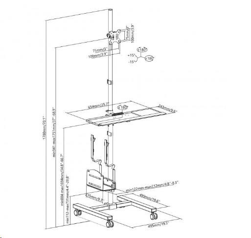 Pojízdný stojan na PC monitor a klávesnici Fiber Mounts AX793 Profesionální řešení pro Vaše mobilní PC pracoviště - mobilní stojan na PC Potřebujete si vytvořit pojízdné PC pracoviště za co nejlepší cenu? Máme pro Vás kompletní řešení za bezkonkurenční cenu - pojízdný stojan s držákem na PC, držákem na monitor a policí na klávesnici. Vše je přitom ergonomické - nastavitelná výška, náklon a natočení monitoru, nastavitelná výška klávesnice a myši, výškové nastavení držáku PC, pojezdová kolečka s aretací. Barevné provedení černé, záruka 3 roky. Stojan na PC s držákem monitoru a policí na klávesnici a myš - mobilní pojízdná PC pracovna -Fiber Mounts AX793 Technické údaje: držák na PC s výškovým polohováním, nosnost 8kg police na klávesnici a myš s výškovým polohováním, nosnost 2kg držák na monitor 17" až 32" s výškovým polohováním, nosnost 10kg držák monitoru podporuje VESA 75x75 a 100x100 / možnost rozšíření až na 200x200 otáčení monitoru do stran +/- 180° náklon monitoru +/- 15° rotace monitoru +/- 180° celková nosnost stojanu 20kg pojezdová kolečka s brzdou systém vedení kabeláže výborná kvalita barevné provedení černé záruka 3 roky Profesionální PC pracovna, pojízdná / mobilní - Fiber Mounts AX793 Stojan na PC, monitor a klávesnici s myší AX793 podporuje VESA standardy pro uchycení monitorů: VESA 75x75 VESA 100x100 v případě potřeby možnost zakoupení rozšíření na VESA 200x100 v případě potřeby možnost zakoupení rozšíření na VESA 200x200. Fiber Mounts s.r.o., Nádražní 1296/4 69601 Rohatec Česká republika, mailto: info@drzakyastolky.cz