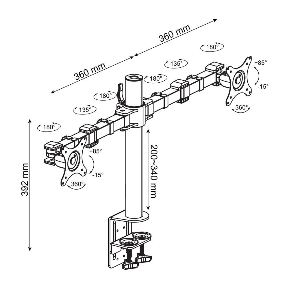Každé rameno držáku má nosnost 10 kg, takže udrží i těžší monitory. Snadné nastavení výšky v rozsahu 200 až 340 mm bez použití nářadí vám umožní přizpůsobit monitory vaší výšce. Díky třem spolehlivým kloubům na každém rameni můžete monitory nezávisle otáčet do stran o +/- 180°, naklápět je v rozmezí +85° až -15° a využít funkci PIVOT pro otočení obrazovky na výšku nebo na šířku.