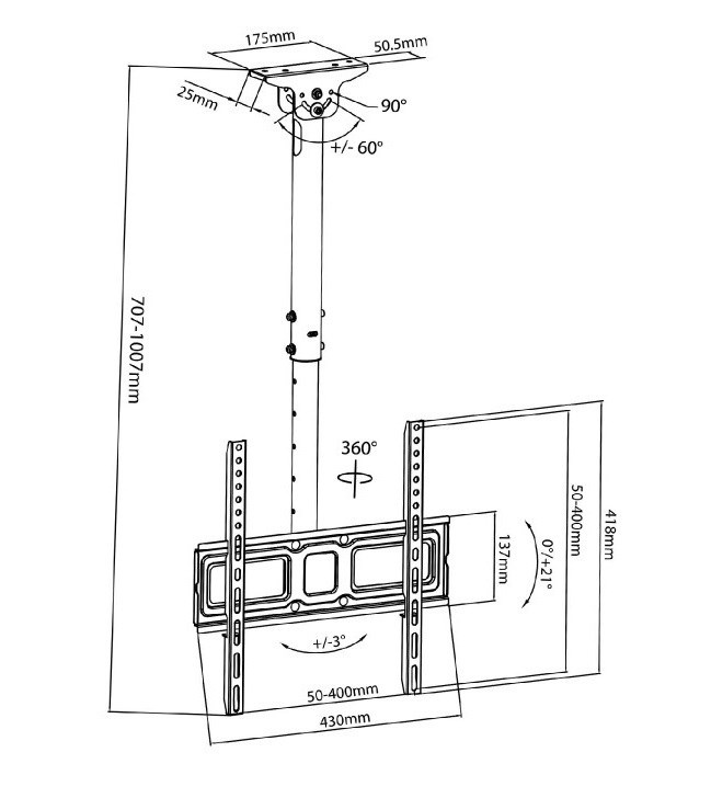 Stropní výsuvný držák na Tv Fiber Mounts M9C43 Stropní (nástěnný) držák na Tv 32-60", nastavení délky 717-1017mm, naklápění 0-21°, VESA 75x75 až 400x400, nosnost 35kg Kvalitní stropní držák na televize nebo monitory s úhlopříčkou 32-60". Držák má nastavitelnou délku od 717mm do 1017mm, umožňuje otáčení a naklápění Tv, uchycení je možné na rovné i šikmé stropy (nebo podkrovky), případně i na stěnu nebo bok stropního trámu - stropní úchyt je variabilní a umožňuje velké úhlové polohování. Veškerou kabeláž snadno ukryjete do těla držáku. Podpora VESA 75*75 až 400*400, nosnost 35kg. Materiál ocel, dodáváno včetně instalačního materiálu. Kvalitní ale levný stropní držák na Tv 32-60" s nastavením délky, otočný a sklopný Fiber Mounts M9C43 Technické údaje: nosnost 35kg podpora VESA standardů 75*75 až 400*400 vhodný na televize i monitory s úhlopříčkou 32-60" nastavitelná délka držáku 717-1017mm naklápění 0° až 21° korekce roviny +/- 3° otočný +/- 180° uchycení na rovné nebo šikmé stropy, na stěny nebo svislé povrchy systém pro skryté vedení kabeláže materiál ocel instalační materiál barevné provedení černé záruka 5 let Úhlově polohovatelný úchyt stropního držáku Tv Fiber Mounts M9C43 Držák podporuje VESA standardy: VESA 75*75 VESA 100*100 VESA 200*100 a 100*200 VESA 200*200 VESA 300*200 a 200*300 VESA 300*300 VESA 400*200 a 200*400 VESA 400*300 a 300*400 VESA 400*400. Fiber Mounts s.r.o., Nádražní 1296/4 69601 Rohatec Česká republika, mailto: info@drzakyastolky.cz